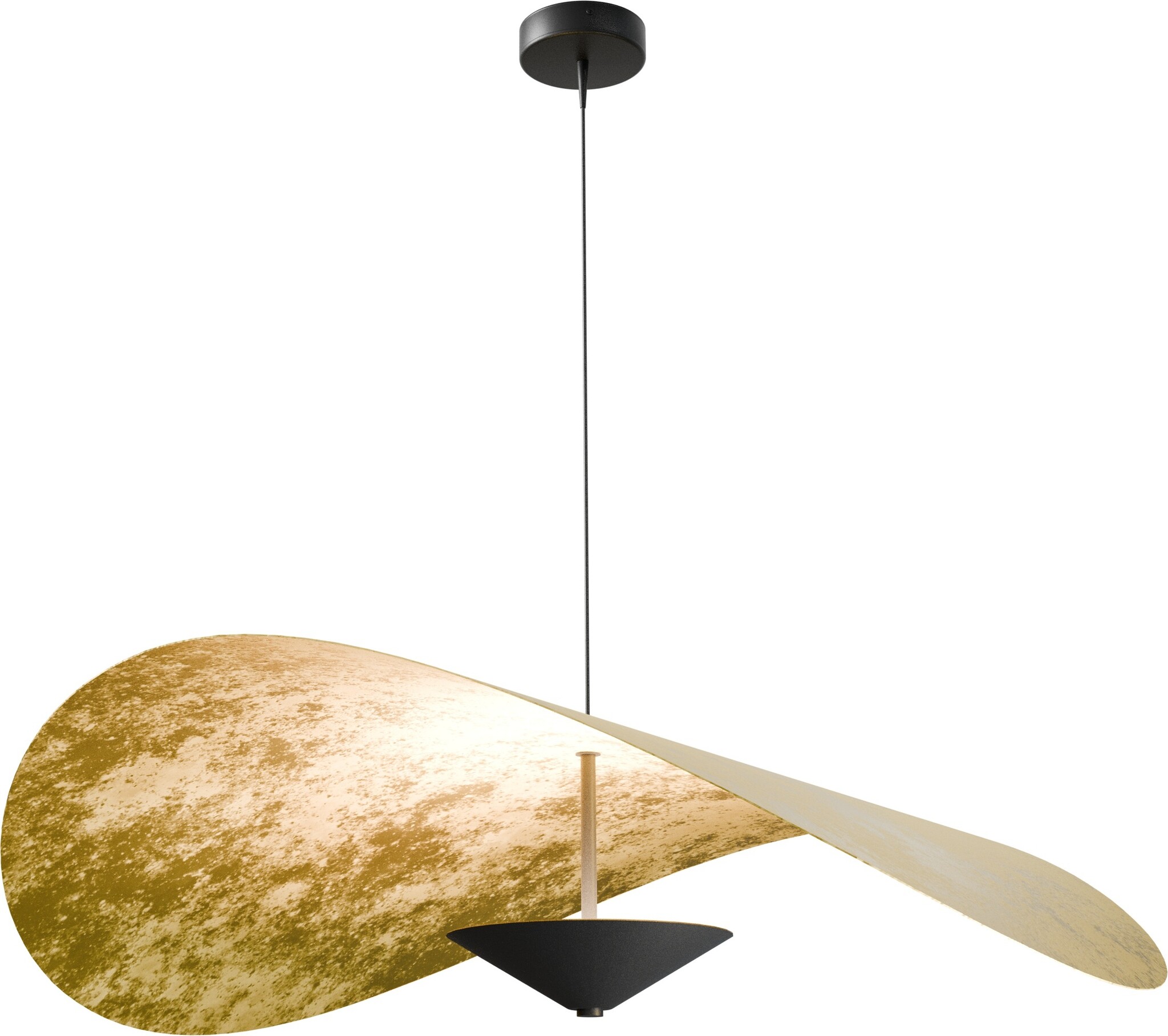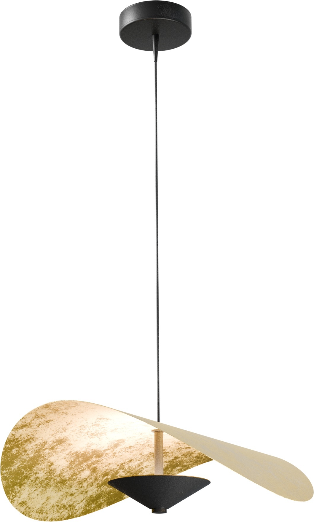 Leuk vormgegeven 1 lichts hanglamp uit de serie Lente, verkrijgbaar in diversen afmetingen. Gemaakt van metaal zwart met goud, met een catrol systeem.
