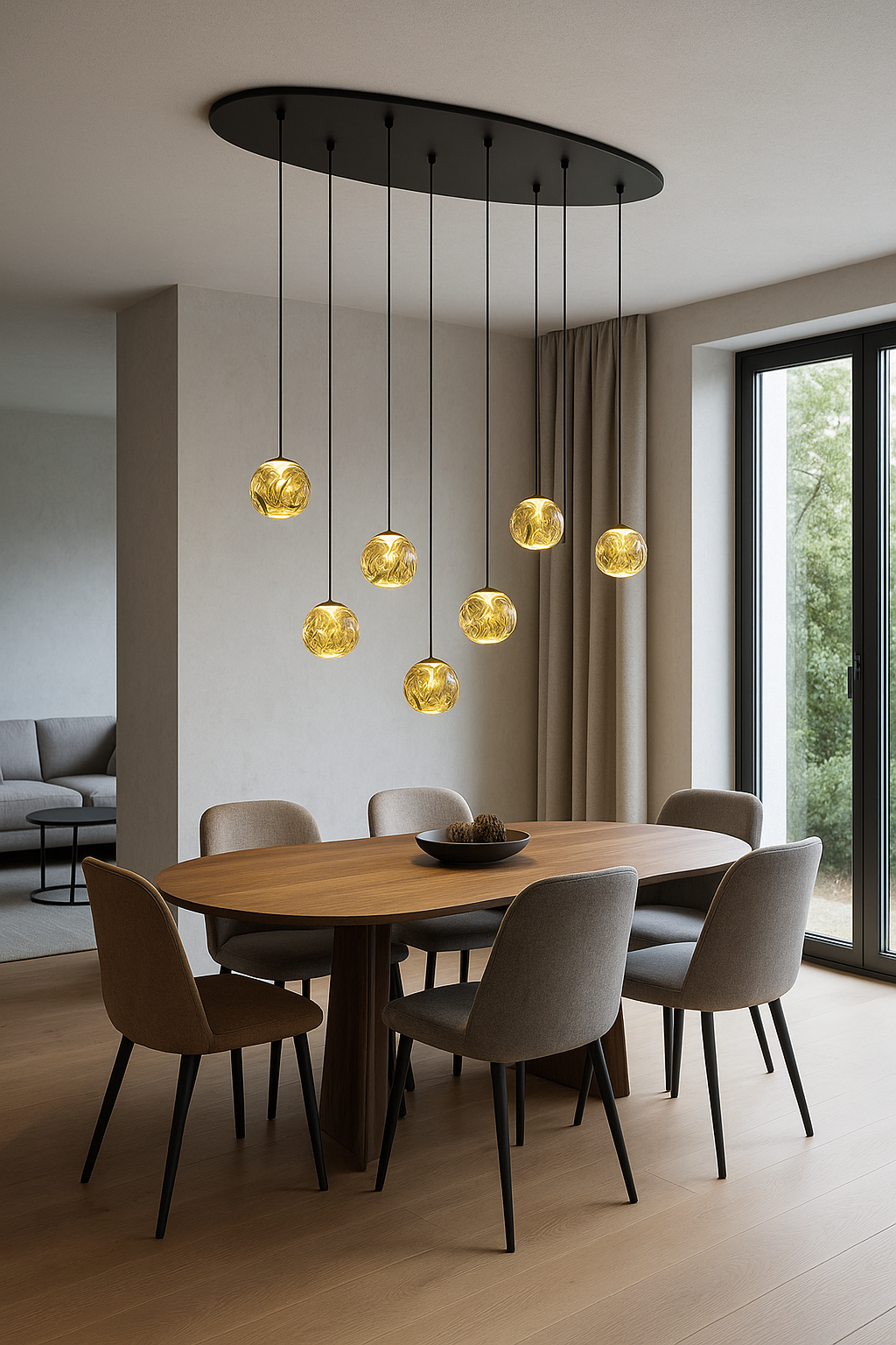 Hanglamp Melina heeft een ovale plafondplaat met een lengte van 140 x 50 cm, waaraan 12 licht- brokken hangen. Lees meer
