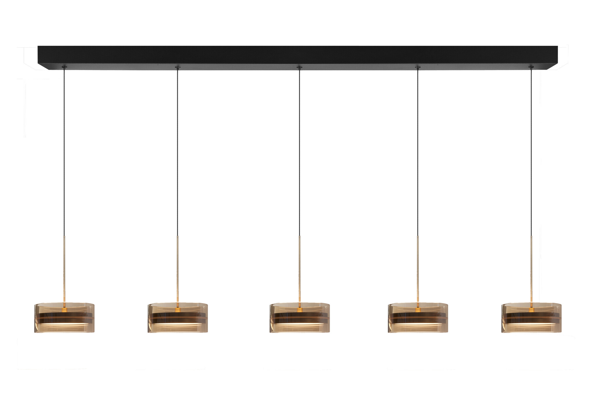 Hanglamp Mini Enzo met een zwarte balk ( 120 cm) met 5 glazen. De amber met transparante glazen naast elkaar aan een transparant snoer,  en zijn in hoogte verstelbaar. De 5 x 12 watt Led is geïntegreerd in de lamp. Diameter van het glas is ... cm.