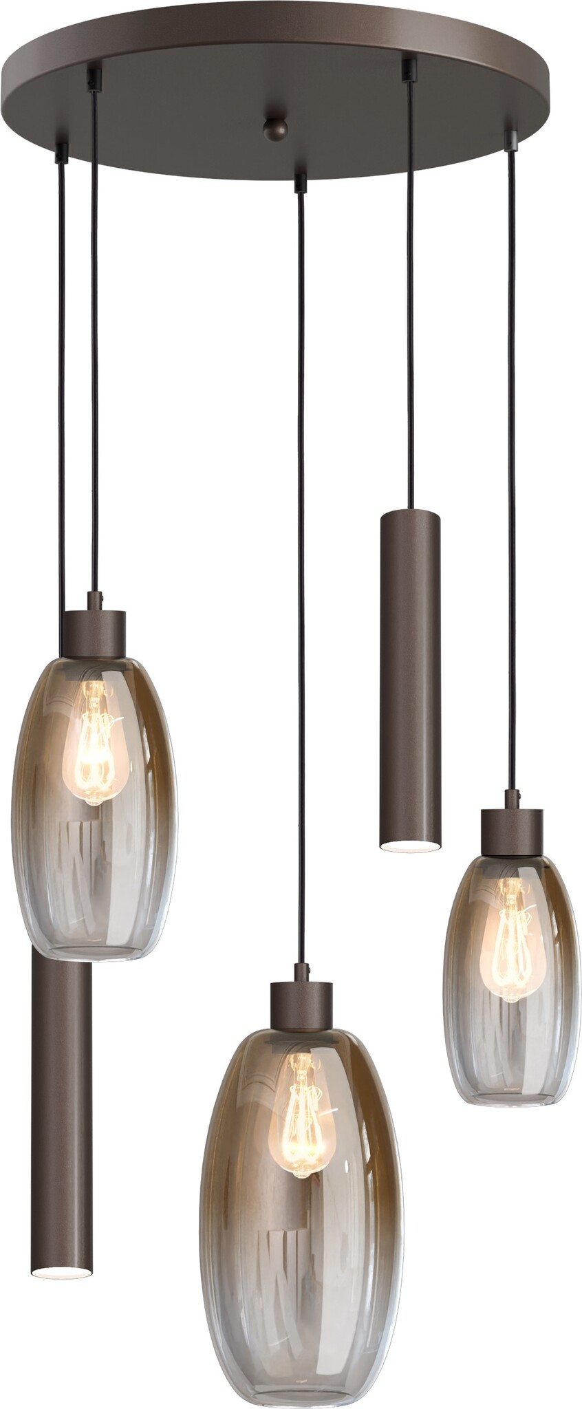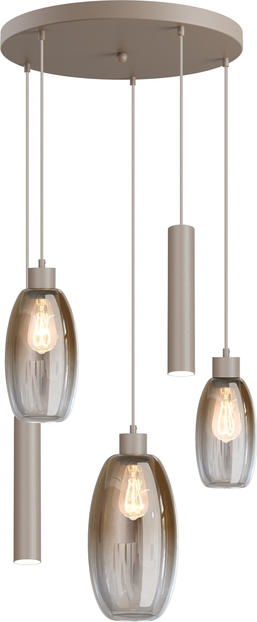 Deze schitterende en van mooie kwaliteit hanglamp rond Olive 3 en 2 lichts heeft een ronde plafondplaat van 50 cm met 3 olijf vormige glazen. ( diameter 15 cm) en 2 kokers. In de kokers kunnen GU10 Led lampen ( excl.) Kleur zwart, beige of cacao.