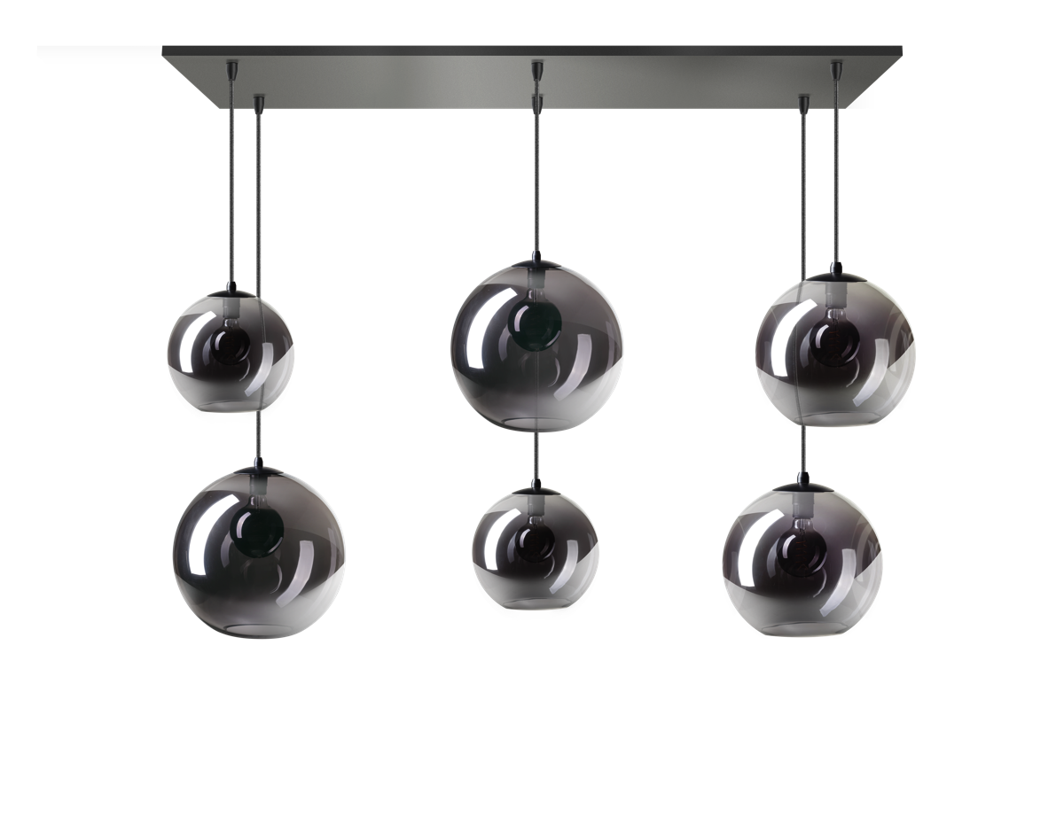 Zwarte balk met eraan 6 smoke lichtbollen ( beetje spiegel-achtig) met een diameter van 2 x 20, 2 x 25 en 2 x 30 cm per bol. Lengte van de balk is 130 x 30 cm. Per glas bol kan er een lamp in met E27 fitting. Kan besteld worden zonder of met Led lampen filament 5 watt.
