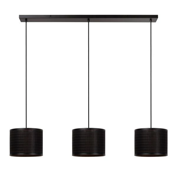 Deze hanglamp uit de serie Tagalog 3 lichts is nieuw, in kleur zwart/hout met een lengte van totaal 130 cm, met 3 kappen van 30 cm doorsnede.  Bevestigingsplaat 110 cm x 10 cm x 2,5 cm.