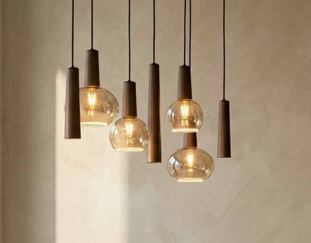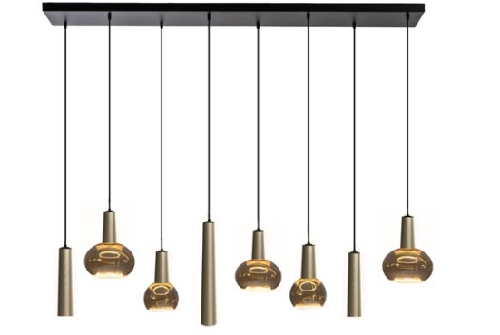 Rustieke Nederlandse kwaliteit hanglamp The Cone Bar, 4 x spot Cone 15 cm E27/2 x spot Cone 25 cm GU10, kleur brons op de foto, maar kan ook in andere kleuren de cone pendel. Bij 160 cm zijn de pendels 15 en 35 cm lang.