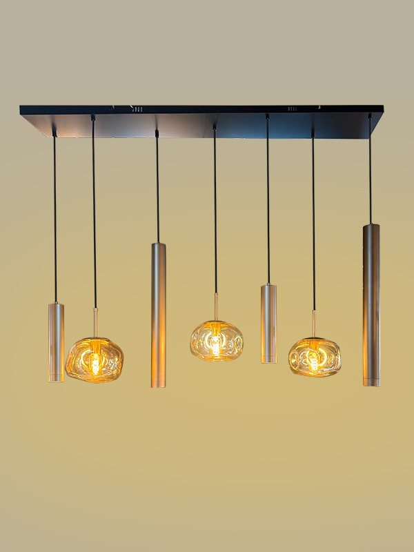 Hanglamp Wolk 4 + 3 ichts balk met eraan 3 lichte wolkvormige glazen, en 4 kokers met een GU10 fitting. Het glas is aan de onderzijde gesloten en wordt erop gedraaid. Glas is verkrijgbaar in glas amber of grijs-smoke. ( bovenaan waar glas mee wordt vastgedraaid) Diameter glas 30 cm. Excl. Led. Buislamp is er in twee uitvoeringen: de touch-versie en de aan-uit-versie. Bel of mail voor overleg.