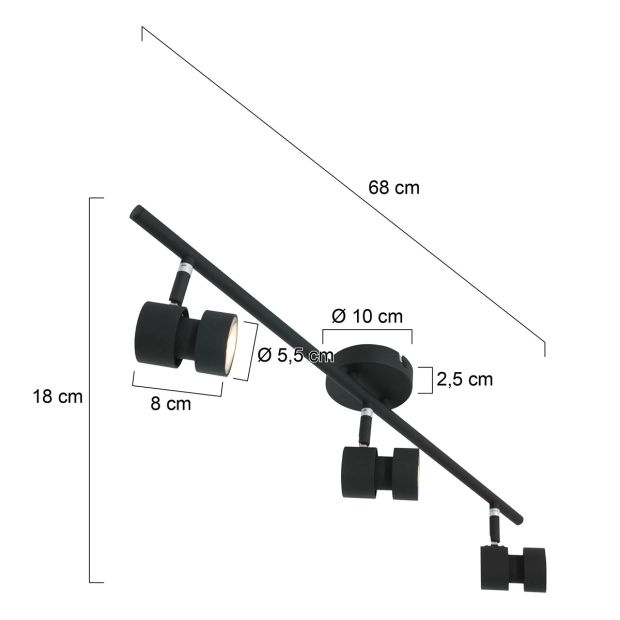 Deze zwarte moderne spot komt uit de Natasja Led serie. Beschikt over GU10 fitting, wordt meegeleverd met 3 ingebouwde Led lichtbronnen van 7 Watt. Vervaardigd uit metaal. Dimbaar, middels een externe dimmer. De spot heeft een lengte van centimeter. De diameter van de spots zijn 5,5 centimeter en zijn 12 centimeter lang. In winkel te zien.