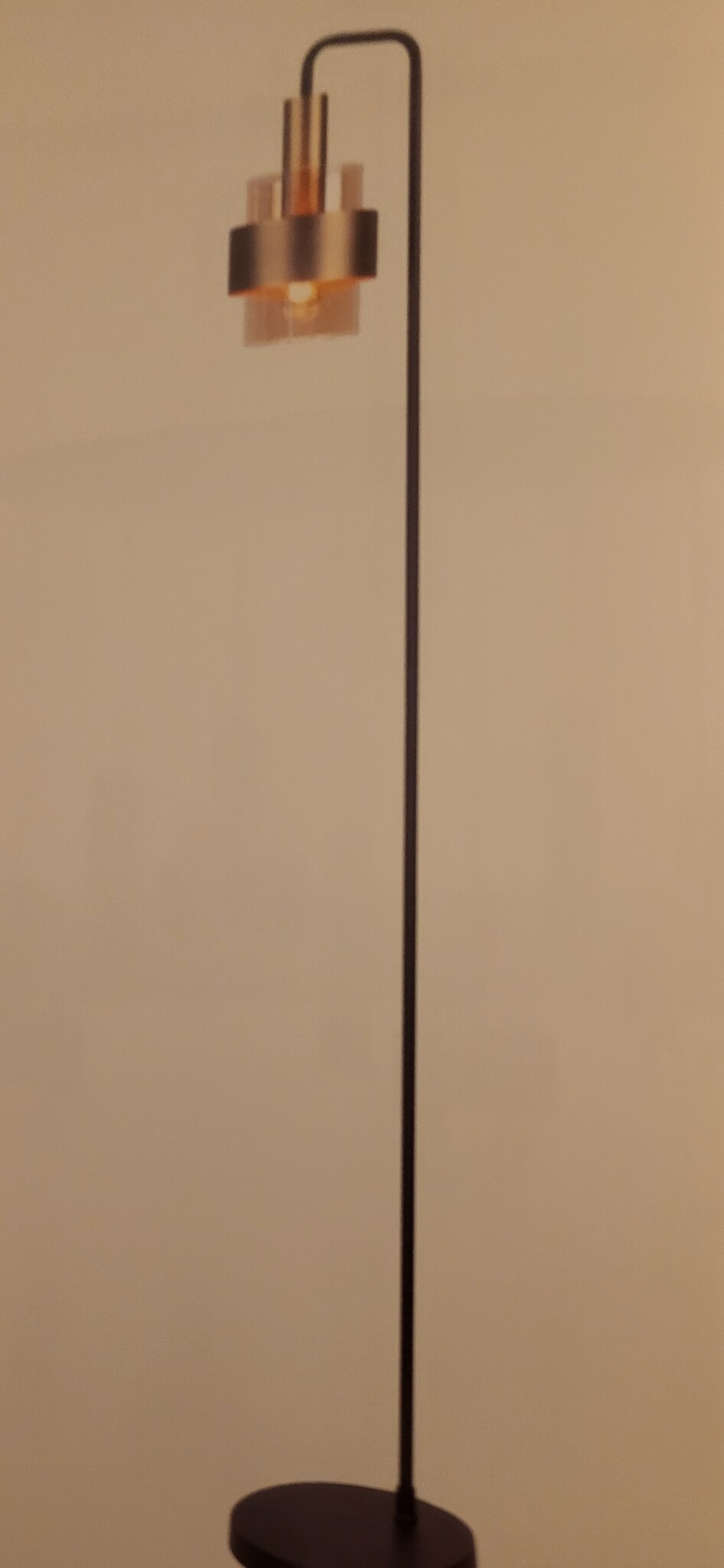 Uit de serie de vloerlamp Marrone. Brons-goud met amber glas. Hoogte 168 cm. Geschikt voor een filament lamp met E27 fitting. Juiste foto volgt nog.